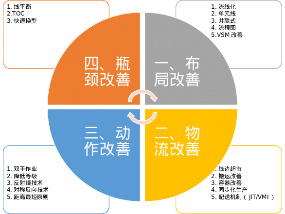 引導(dǎo)結(jié)論:現(xiàn)場改善主要從四個方面開展,分別是布局改善、物流改善、動作改善、瓶頸改善。