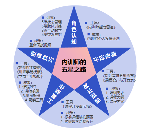 形成閉環:課程基于內訓師“五星模型”進行設計,內容覆蓋企業內訓全流程,學員以任務驅動的形式在課程中完成“課程設計-課程開發-工具制作-講臺呈現”的內訓閉環,保證內容的完整性和落地性